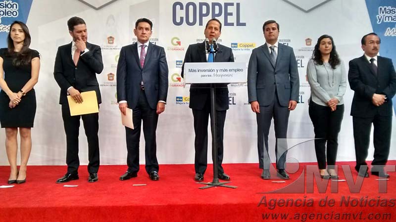 La puesta en operación en los dos próximos años de 598 tiendas, zapaterías, mueblerías y dos Centros de Distribución del grupo comercial Coppel, ubicados en Toluca-Almoloya, con poco más de 75 mil metros cuadrados de área de almacenaje, y otro en Texcoco, para en su conjunto generar una inversión de 2 mil 788 millones de pesos y la creación de más de 15 mil 700 empleos directos.