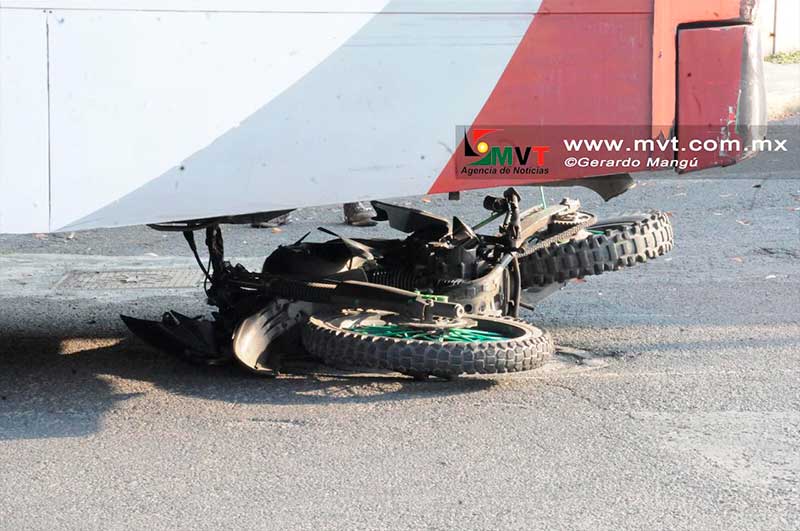 El oficial tras ser arrollado por el chofer del camión de pasajeros quedó tendido sobre el asfalto, ya sin signos vitales, mientras que la moto fue arrastrada por varios metros.