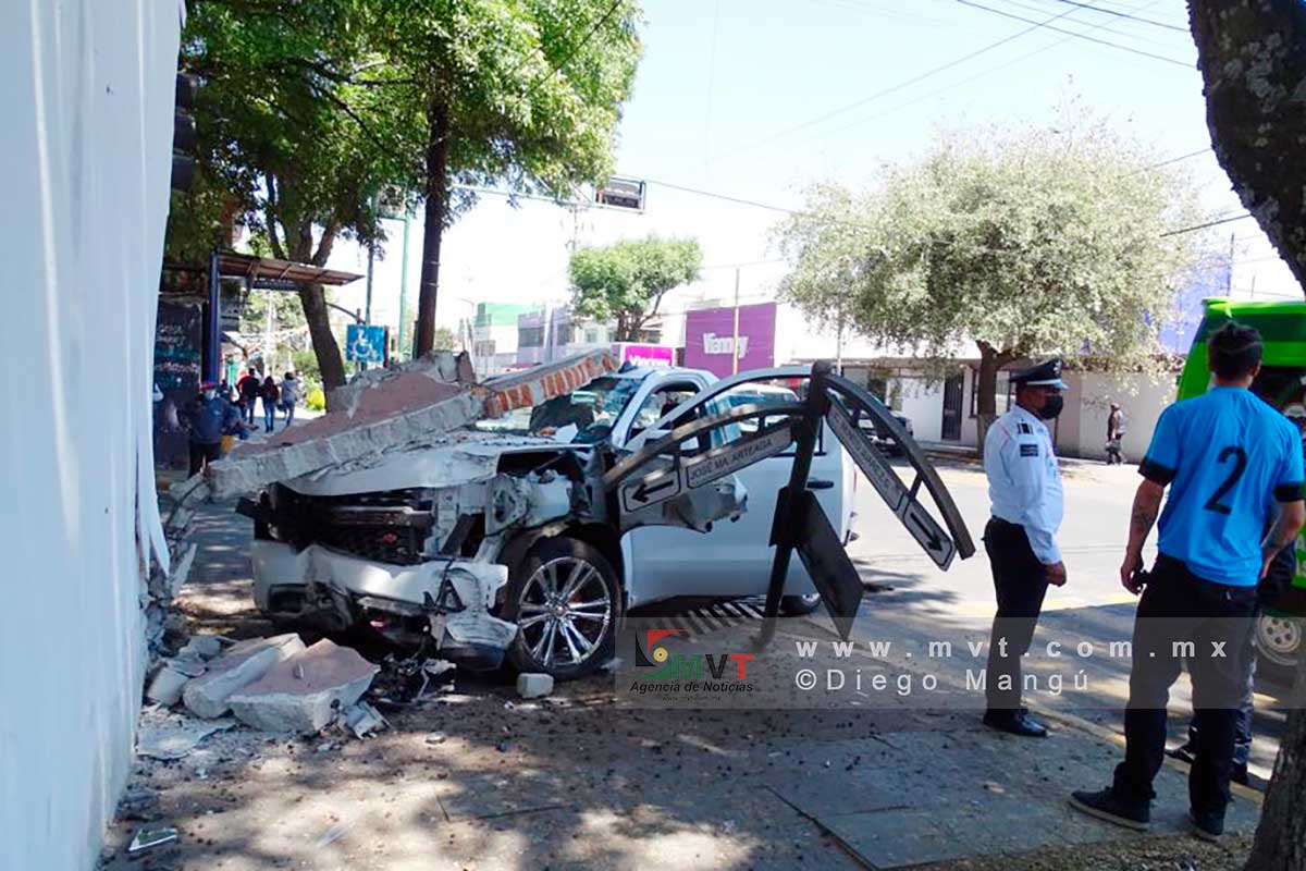 La troca acabó incrustada en la barda y el chofer resultó ileso.