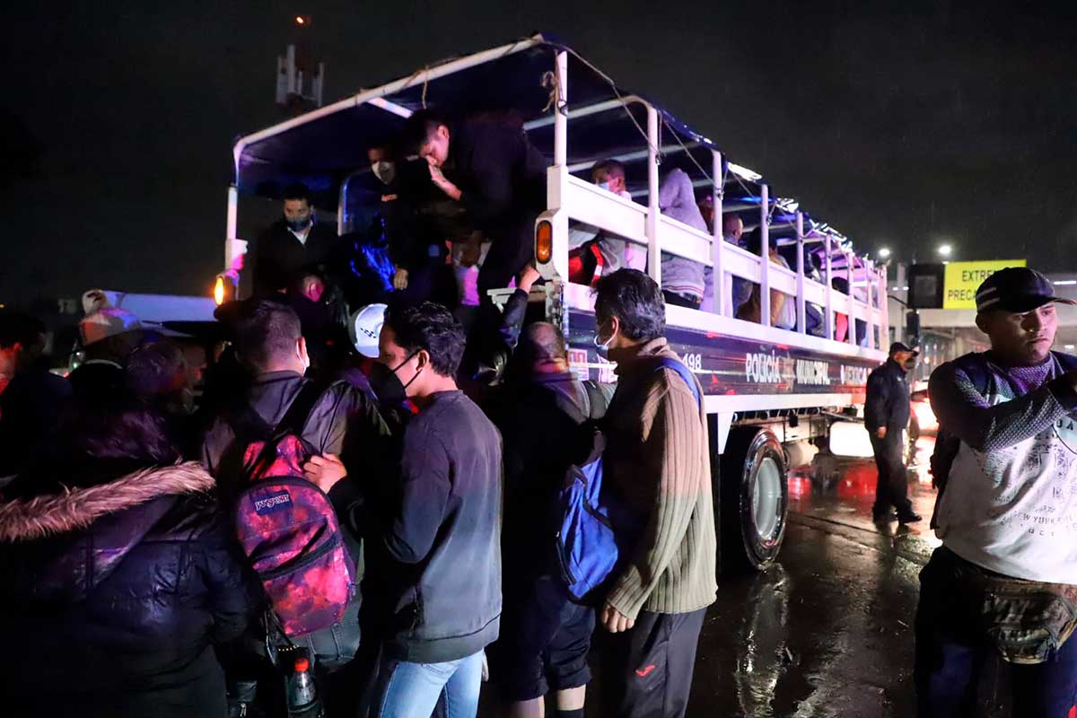 A bordo de los camiones multipropósito de la Dirección de Seguridad Pública, conocidos como Mexicas, policías municipales transportaron a personas que quedaron varadas sobre la avenida Insurgentes, vía morelos y comunidades de la quinta zona como Fuentes de Aragón, Polígonos 1, Valle de Aragón tercera sección, Nueva Aragón, entre otras.