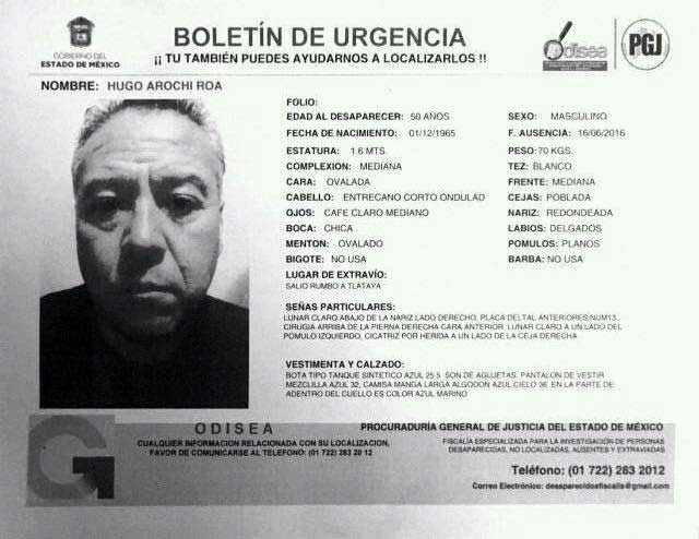 La Procuraduría General de Justicia del Estado de México ha emitido las alertas correspondientes del sistema Odisea, por lo que cualquier información relacionada con su localización, o del paradero del vehículo Dodge Dakota, modelo 2011, tipo pick up doble cabina, color plata, con placas de circulación de la Ciudad de México 707-XNW, será recibida en los teléfonos MarcaSAT: 627 22 728 desde la Ciudad de México, o 01 55 627 22 728 del resto del país, así como en el correo desaparecidosfiscalia@gmail.com