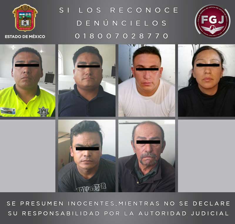 Coacalco, México, 14 de agosto de 2019.- Elementos de la Fiscalía General de Justicia del Estado de México (FGJEM), detuvieron a cuatro policías de este municipio y dos civiles, quienes son investigados por presuntamente exigir la cantidad de 7 mil 500 pesos a un conductor a cambio de devolverle un tractocamión que habría sido retenido por policías municipales, en la Vía López Portillo.