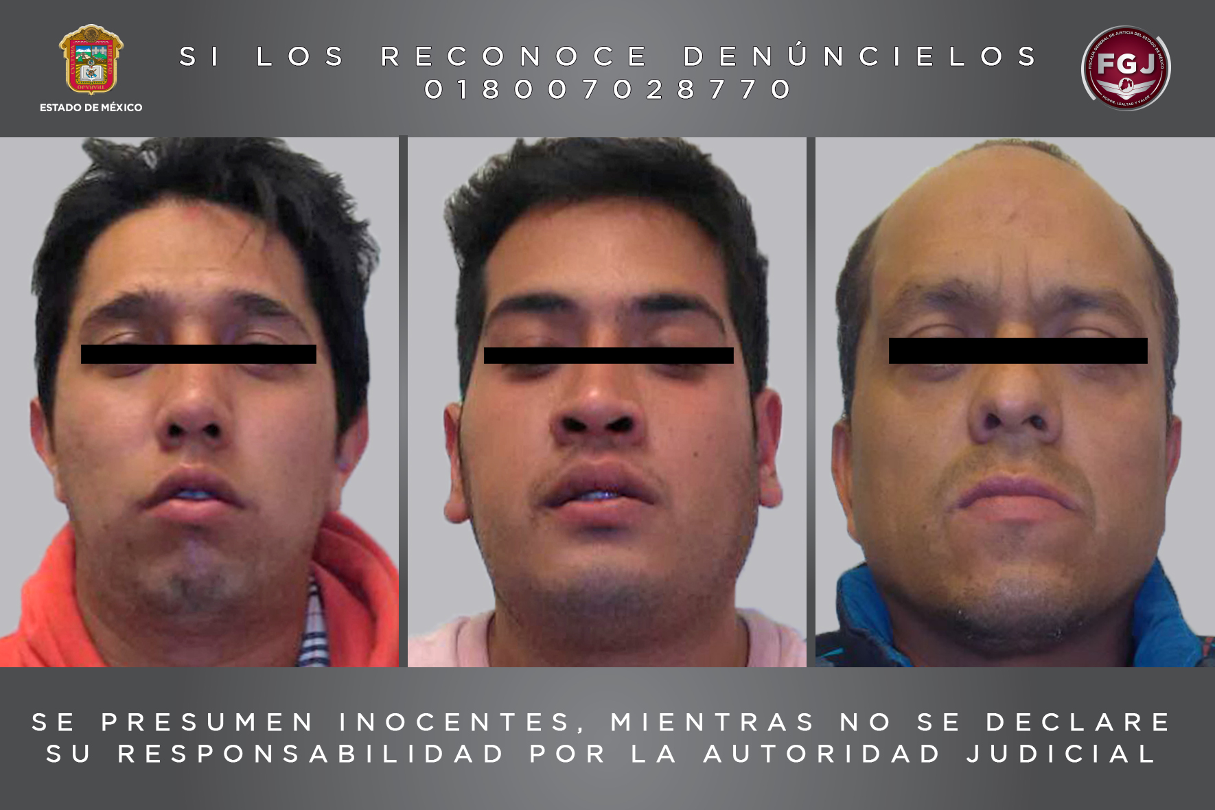 La Fiscalía de Justicia estatal hace un llamado a la ciudadanía para que en caso de que reconozca a estos sujetos como probables partícipes de algún otro ilícito, sean denunciados a través del correo electrónico cerotolerancia@edomex.gob.mx, o al número telefónico 01 800 7028770.
