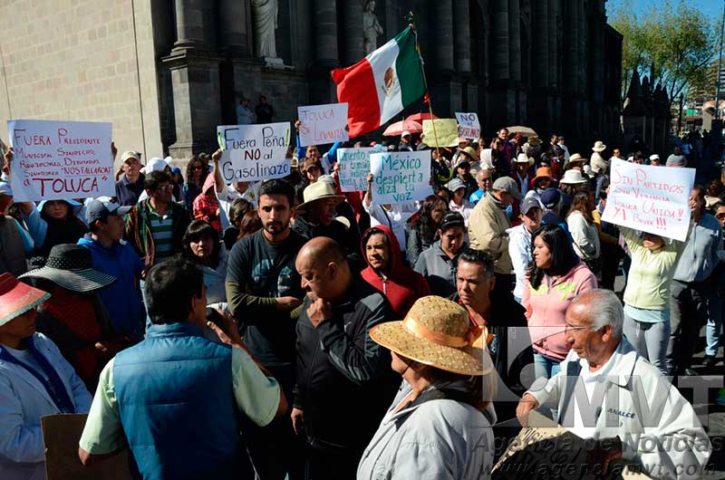 TOLUCA, México, 22 de Enero.- Habitantes de la capital mexiquense se dieron cita este domingo, en punto de las 10:00 horas, en la Catedral de la ciudad de Toluca, para manifestarse de forma pacífica en contra del gasolinazo y el consecuente aumento a los precios de la canasta básica y servicios domésticos, principalmente el gas LP.