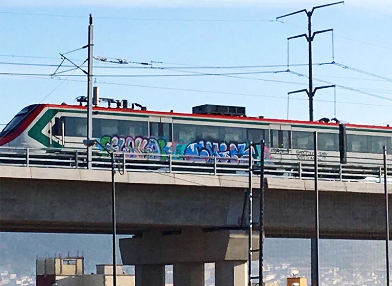 Usuarios de las redes sociales compartieron fotografías de la punta del tren «graffitteada» con grandes letras en colores verde, azul, blanco y crema, la cuales aparentemente fueron realizadas durante la noche del domingo y madrugada de este lunes.
