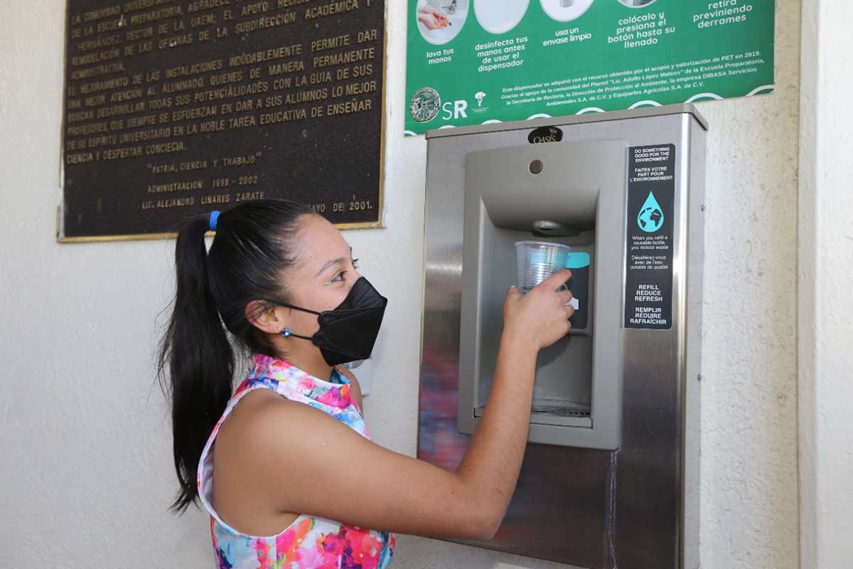 TOLUCA, México, 2 de Agosto de 2022.- Con el propósito de reducir el consumo de plástico de un solo uso e impulsar la reducción de residuos sólidos, diversos espacios de la Universidad Autónoma del Estado de México (UAEMéx) cuentan con equipos de purificación de agua, en los cuales, de manera gratuita, la comunidad universitaria puede rellenar sus botellas.