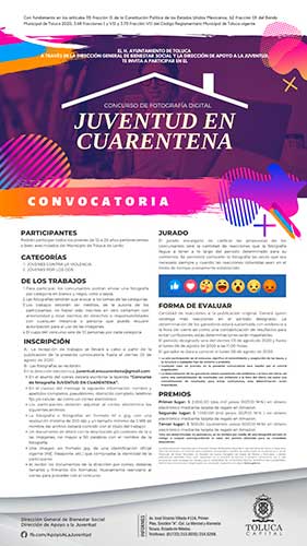 La Dirección de Apoyo a la Juventud de Toluca, por instrucciones del presidente municipal Juan Rodolfo Sánchez Gómez, lanzó esta convocatoria con el objetivo de motivar a los jóvenes a desarrollar sus talentos y a aprovechar el tiempo durante la contingencia por COVID-19.