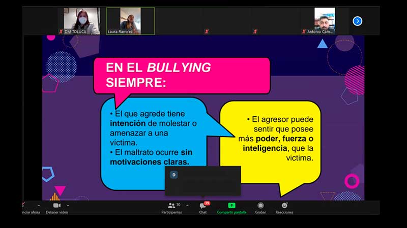 Toluca, Estado de México, 16 de febrero de 2021.- Con el objetivo de construir una sociedad más justa y en paz, la Defensoría Municipal de Derechos Humanos de Toluca ha impartido de forma virtual la plática «La no discriminación y erradicación del bullying» a estudiantes de la capital.