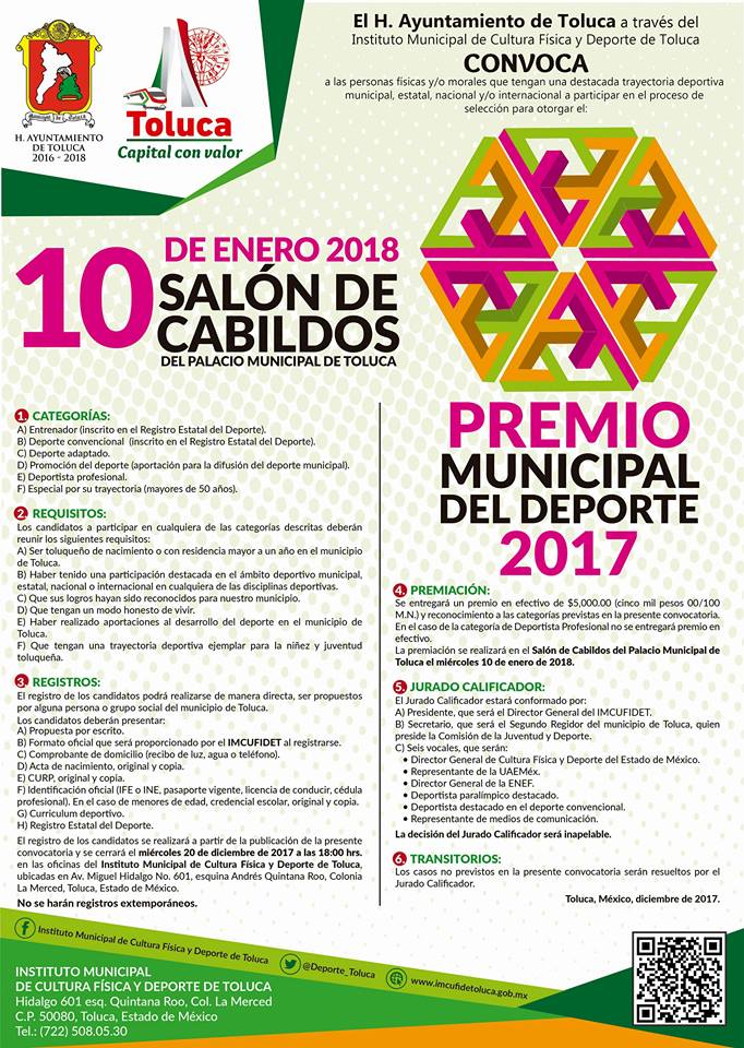 TOLUCA, México, 18 de Diciembre del 2017.- Con el propósito de reconocer a las y los deportistas por su trayectoria, resultados y relevancia municipal, estatal, nacional e internacional en cualquier disciplina, el gobierno de Toluca, a través del Instituto Municipal de Cultura Física y Deporte, (IMCUFIDET) convoca al Premio Municipal del Deporte 2017.
