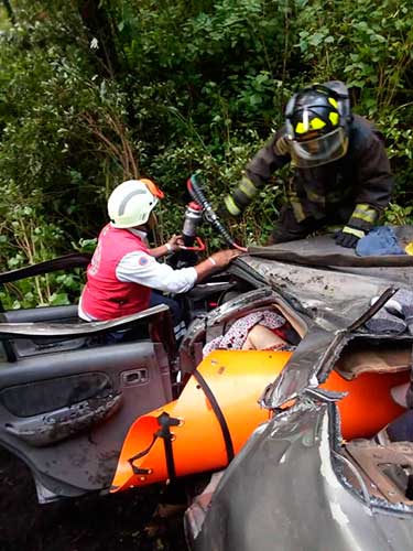 Dentro a auto encontraron a una mujer que estaba prensada, fue necesario que los bomberos descendieran equipo hidráulico para abrir las láminas que mantenían atrapada a la mujer y cortar el toldo del vehículo para poder rescatarla.