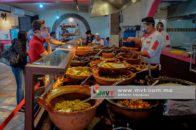 Mientras los comensales reciben su plato, Javier, el mesero, echa un vistazo al establecimiento para identificar la mesa que les asignará a fin de cumplir con el requerimiento de la sana distancia.