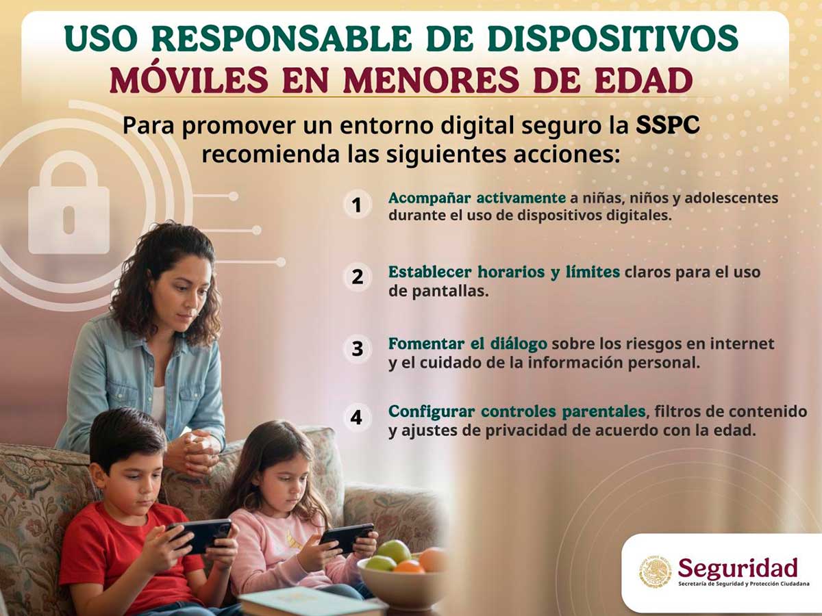 Con el objetivo de fortalecer la protección de niñas, niños y adolescentes en entornos digitales, la Secretaría de Seguridad y Protección Ciudadana (SSPC), a través de la Unidad de Inteligencia, Investigación Cibernética y Operaciones Tecnológicas, emitió una serie de recomendaciones para el uso responsable de dispositivos móviles, desde un enfoque de acompañamiento y corresponsabilidad.