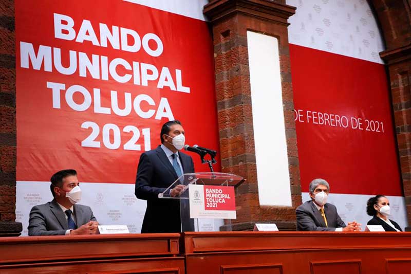 Asimismo, aseguró que a pesar del sufrimiento Toluca es resistente, es fuerte, está unida y sigue dando motivos para la esperanza; “la recuperación no será fácil, el virus estará con nosotros durante una gran parte de este año, los impactos económicos también continuarán, habrá que tomar decisiones más difíciles, pero pase lo que pase estoy convencido de que los toluqueños nos mantendremos fieles a nuestros valores, creemos en la responsabilidad ciudadana, creemos en el cuidado de los más vulnerables, porque son a los que más queremos y más cuidamos, seguimos creyendo en la justicia y seguimos creyendo que podemos seguir construyendo oportunidades para todos. Este es el momento para reafirmar estos valores y así lo hemos hecho a través de la actualización del Bando Municipal de Toluca”.