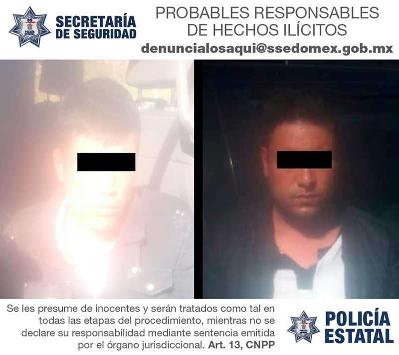 Luego de casi 20 minutos de persecución, los efectivos de la SS, lograron asegurar el automotor y aprehender a dos tripulantes, Abigail “N” y Julio Elías “N” de 24 y 32 años de edad, respectivamente, en un punto identificado como el Toro Manchado, colindante con el municipio de Acambay .