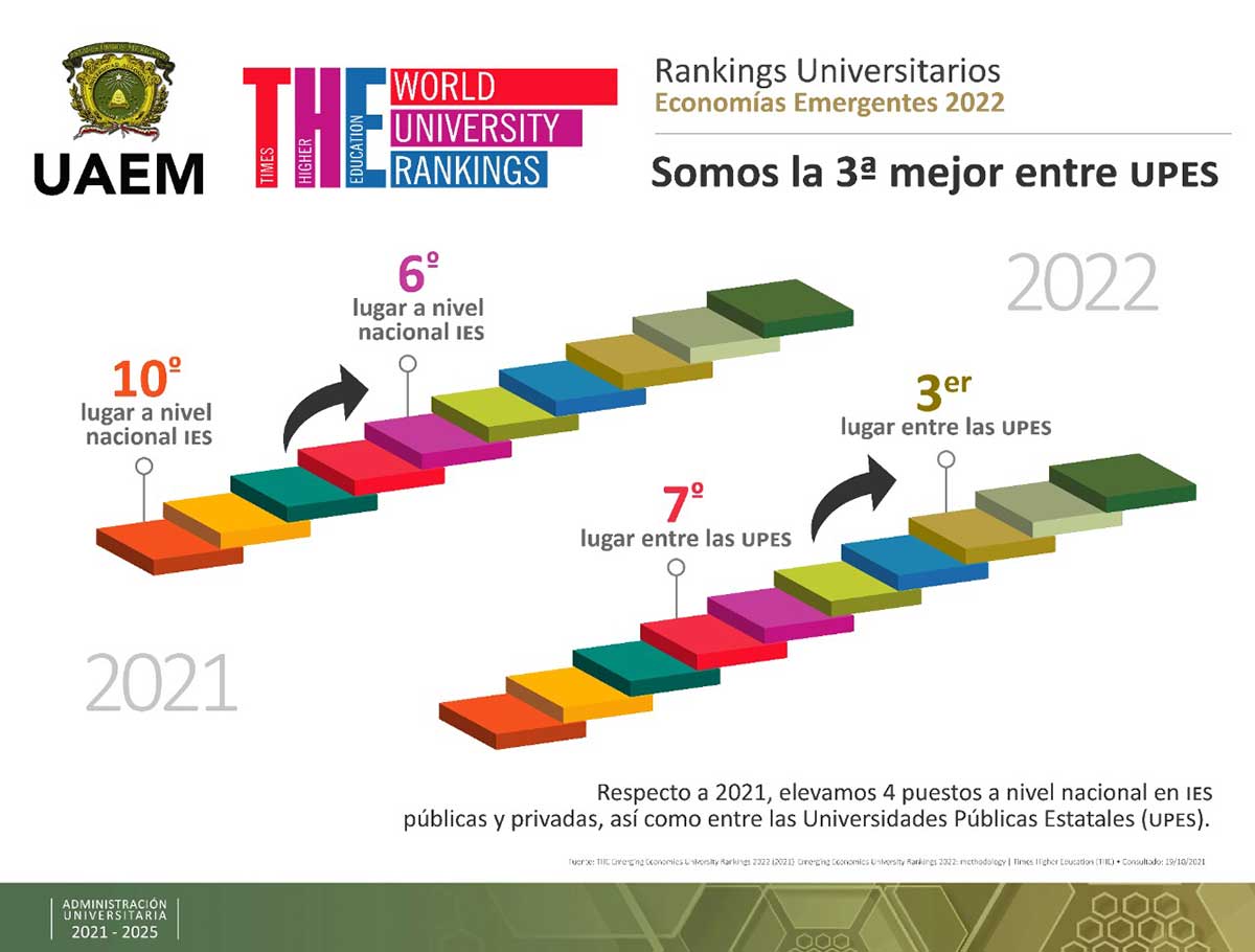 - Por su calidad educativa y productividad científica, la UAEM ocupa el 6to lugar nacional, entre Instituciones de Educación Superior públicas y privadas, de acuerdo con THE en su clasificación Ranking Universitarios de Economías Emergentes 2022